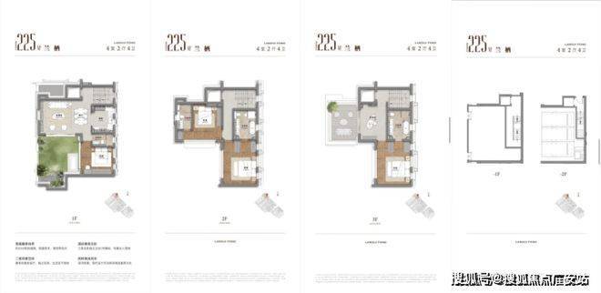 外围沿街临河同样为建面约225㎡四房联排风貌别墅,主要区别在于客餐厅和花园面积做了缩减,但优势在于卧室空间的处理: