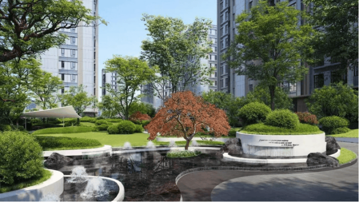 第一重酒店式门庭,约32米宽6.5米高的入户门头,采用蓝翡翠奢石、名贵松树等,营造酒店落客的微度假氛围;门头进来,是约3000平米的大草坪和水景,种植名贵树种,尊崇感拉满。