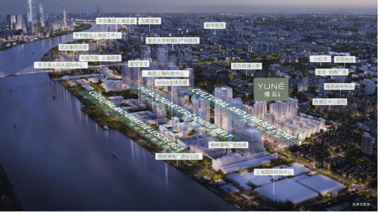 “两翼”中的南翼“动韵桥芯”片区,数字经济总部集群落地成效显著:美团上海科技中心(预计2025年底竣工)、B站总部(预计2026年3月底竣工)、抖音总部(预计2026年竣工)等正加速推进建设,总部与滨江创智中心已串珠成链,形成新质生产力“科创秀带”,预计2027年将集聚3000家在线新经济企业,实现3000亿元产值规模。