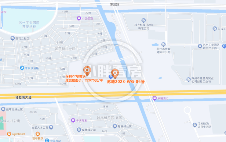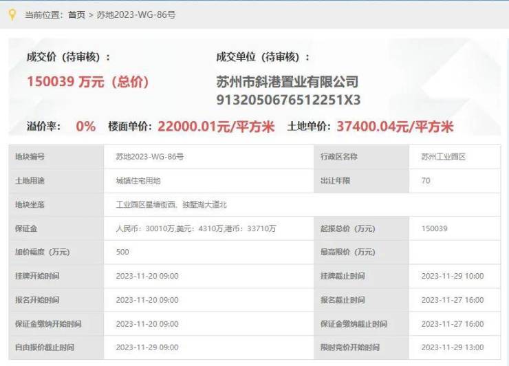 建屋·新棠玥,即斜港置业斜塘86号地块项目,即,苏地2023-WG-86号地块项目,位于工业园区星塘街西、独墅湖大道北,是2023年11月29日,斜港置业以底价150039万元竞得,成交楼面价22000元/平。