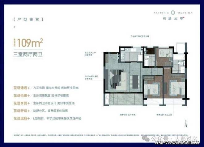 "109㎡ unit: 3 bedrooms, 2 living rooms, 2 bathrooms