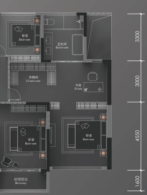中间区域更是足够放下衣帽间和内置书房……这样的设计,放到黄浦江边的顶级豪宅身上都不落伍。