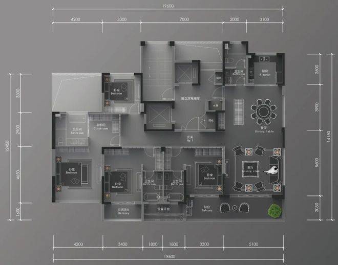 接下来是这次加推中,新入市的两款户型,首先是约238㎡的双梯入户大平层。