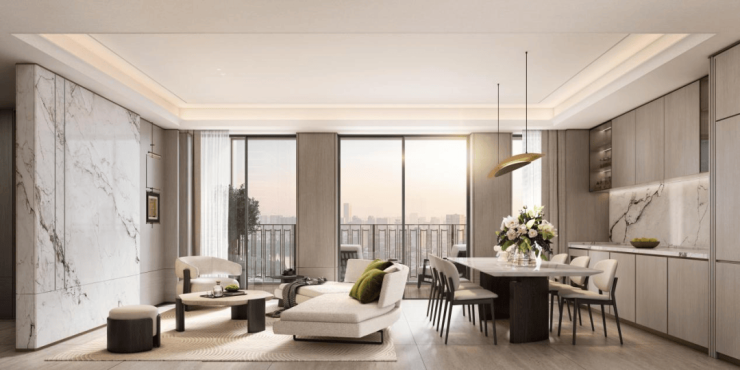 项目整个餐客厅均为岩板交付,岩板的尺寸达到了2.4米*1.2米,这是市面上非常罕见的大板配置,即便是市区豪宅,用的大尺寸也不过是1.8米!