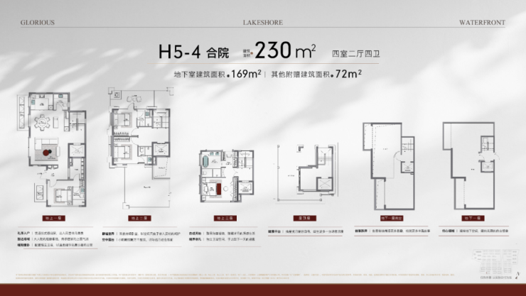 合院:建面约190㎡三室两厅三卫、约210-230㎡四室两厅三卫/四卫,附赠地下室+露台,总价预计约2000万;3层地上+地下室设计。