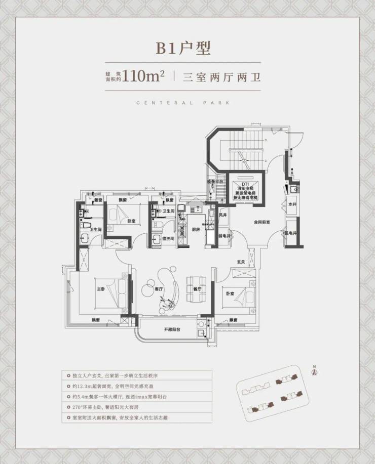 先来看建面约110㎡边套大横厅户型:约12.3米的超宽绰面宽几乎是堪比别墅产品了,这个视野和南向采光面相当出众。
