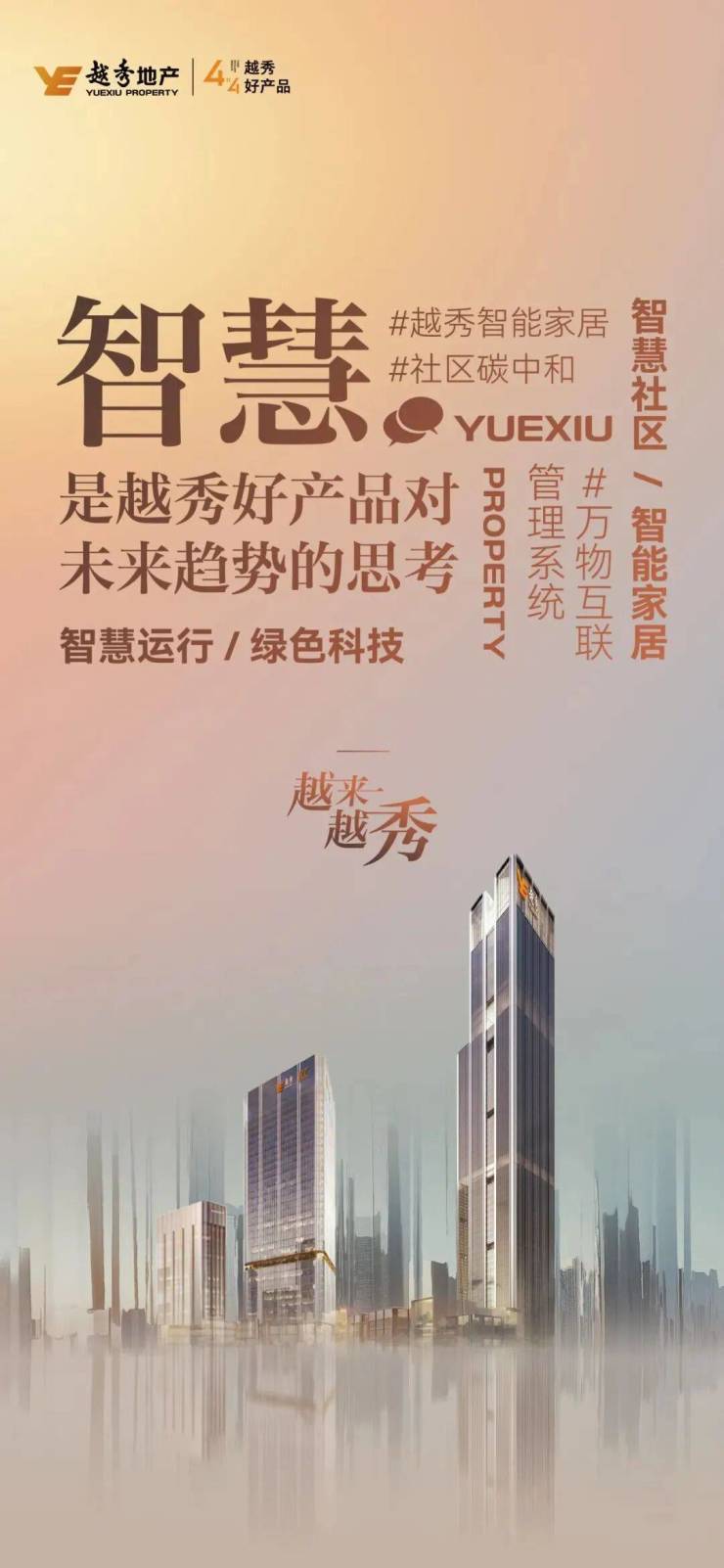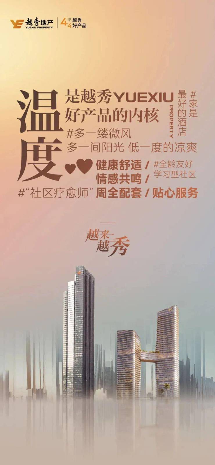越秀地产,千亿龙头国企,实力筑就广州IFC、琶洲南TOD、越秀·和樾府等城市地标。秉持“品质、温度、智慧、成长”四大核心,以“4x4好产品理念”锻造硬核实力的“六边形战士”。