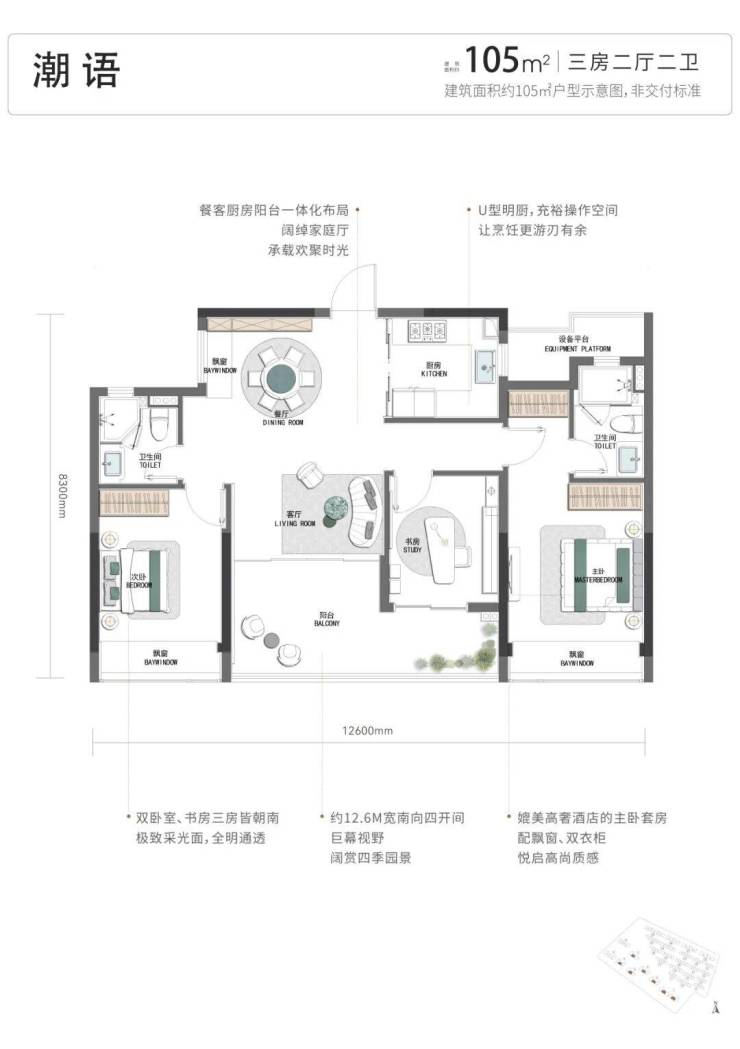 105㎡做到四开间朝南,面宽约 12.6 米,同面积段罕见