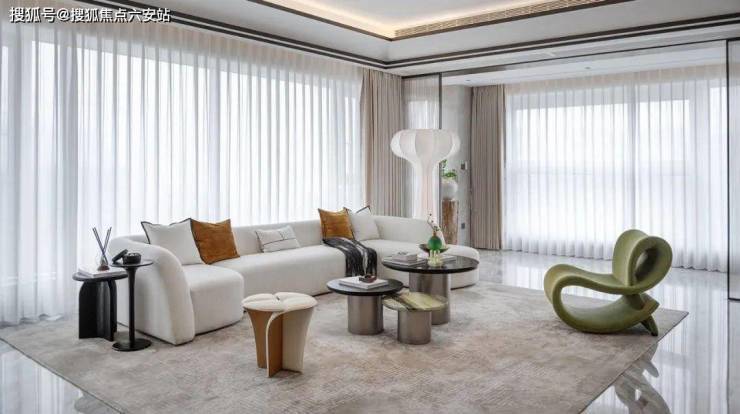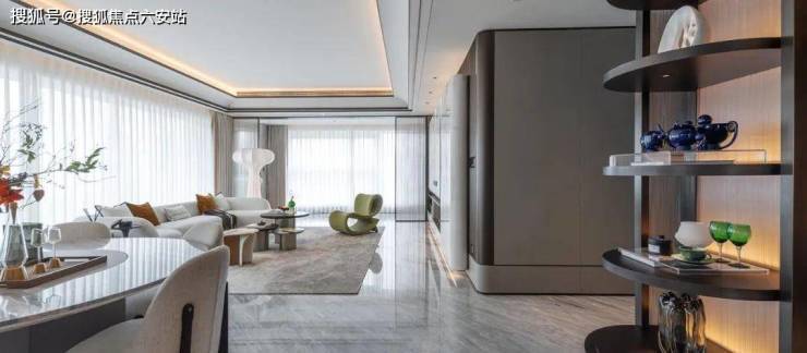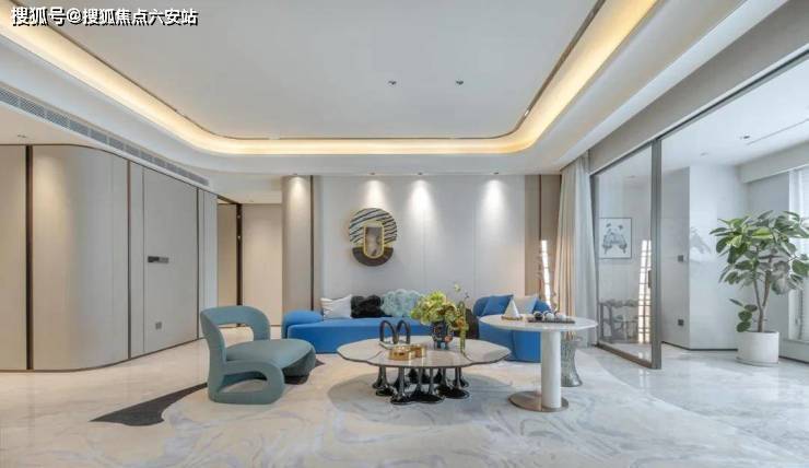 客厅选用芬迪白奢石作为背景墙,搭配金属框线,加强空间价值感。