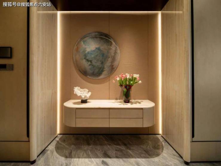 这是一套五房四卫的设计。步入玄关,大面积的直纹白玉和铜丝皮革组成的玄关背景,搭配富有禅意的软装和灯光,组成一幅绝美的3D壁画。玉石自然价值不菲,这个铜丝皮革用的是人工编织的铜丝,手感顺滑,当然它的价格也矜贵,光这幅背景就要近十万元。
