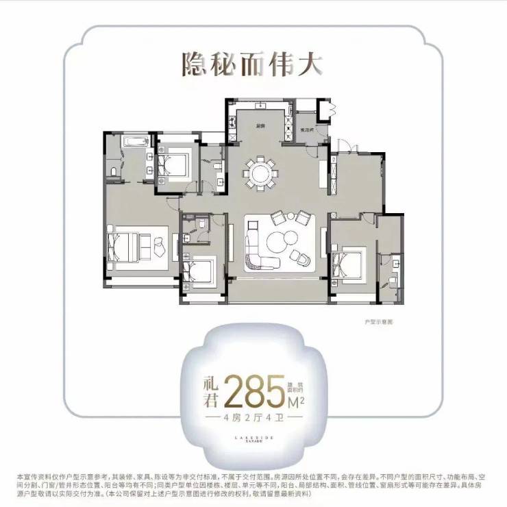 285㎡ 4房4卫:2梯2户设计,5开间朝南,客厅开间7.4米,主卧开间5.5米,总价约1268万起(单价46493元/㎡起)25。