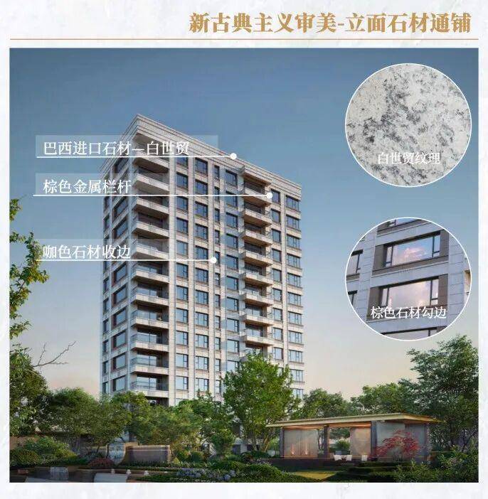 匠造新古典主义与当代新潮审美融合的奢材立面,甄选巴西进口白世贸石材通体雕琢,尽显庄重大气的格调,从细节营造恒久建筑质感。