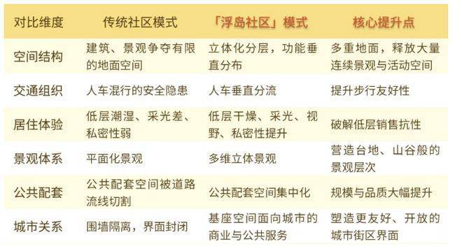 对比传统社区布局,项目从空间结构、交通组织、居住体验、景观体系、公共配套到城市关系六大层面,均带来显著的提升与革新。