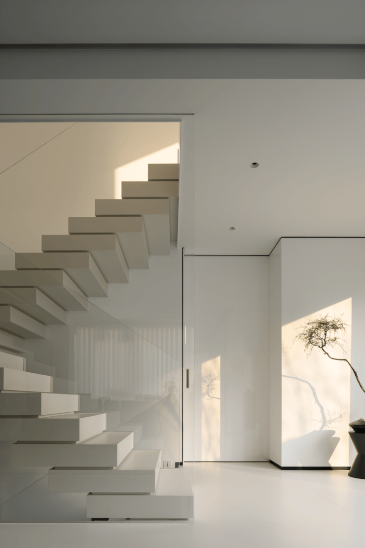 楼梯选用了纯白色,光是唯一的装饰品,在寻常中展现着空间最为纯粹的美。