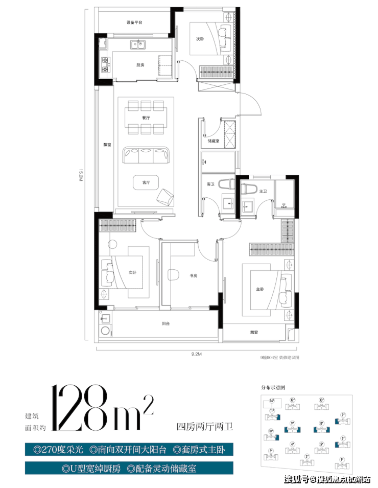 建筑面积约128㎡四房两厅两卫户型,采用“4+1”房设计,满足二胎家庭或三代同堂的居住需求,更比同类面积多了一个储藏空间。三房朝南,餐客厅尺度完全媲美140方以上户型,并且还有一个储藏间,非常贴近二孩家庭或者三代同堂家庭的需求。