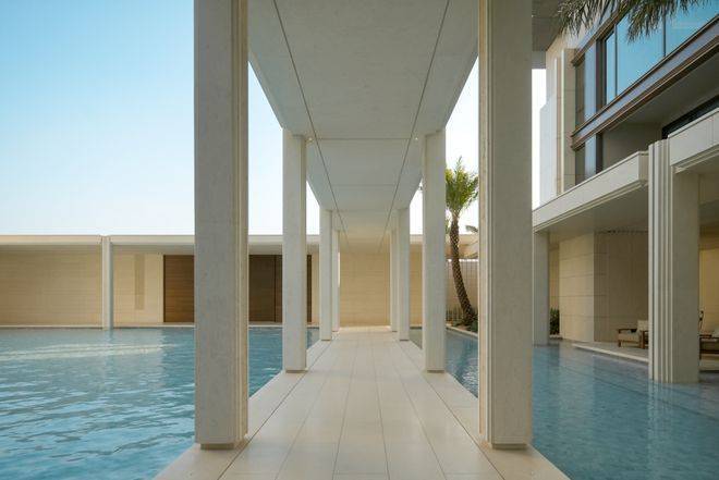 作为首个度假风情的住区,璟逸汲取希腊安缦酒店与Gundari度假村的精髓。素雅的米白石壁墙引领访客,穿行于水院与连廊之间,步入白色莱姆石建筑群,冰蓝水面与沙生植物交织的闲适景致,仿佛将圣托里尼的暖阳拥入怀中。