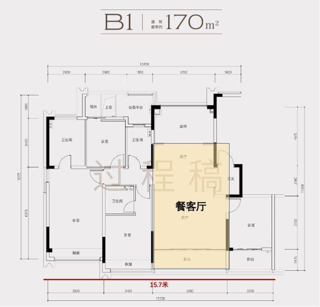 170㎡,4开间超南面宽达15.7米;餐客厅面积达到44个平方米;厨房开间达到4.35米。