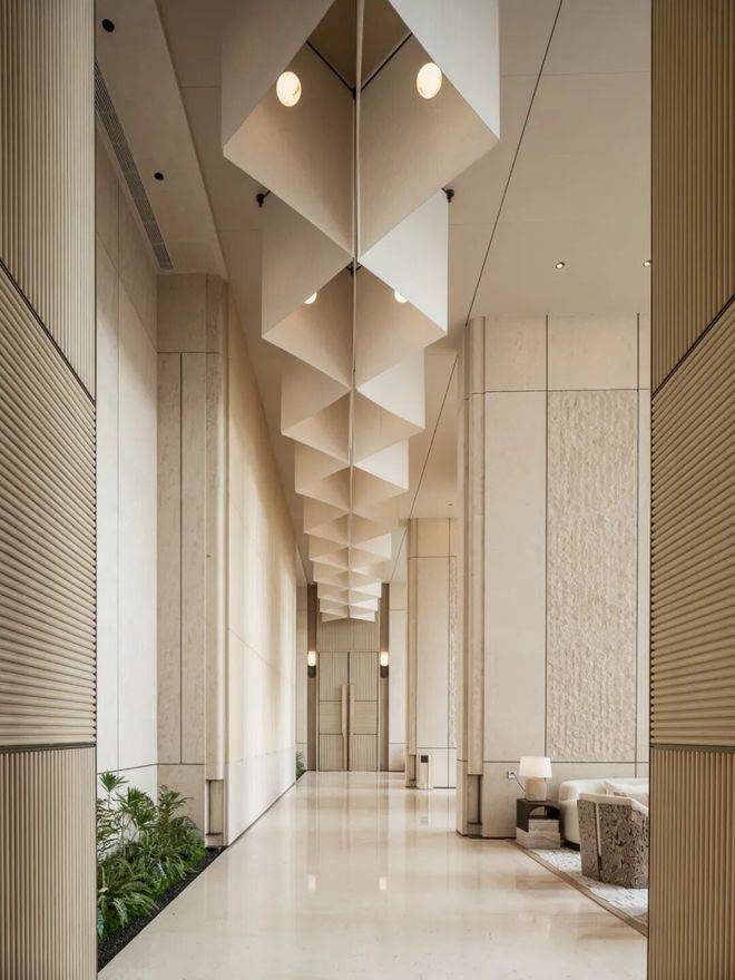 它将行政酒廊与砾石花园自然衔接,又以无边观景平台延展至下层会客空间,营造出纯净而优雅的高差漫游体验,让行进的每一步皆成风景的延续。