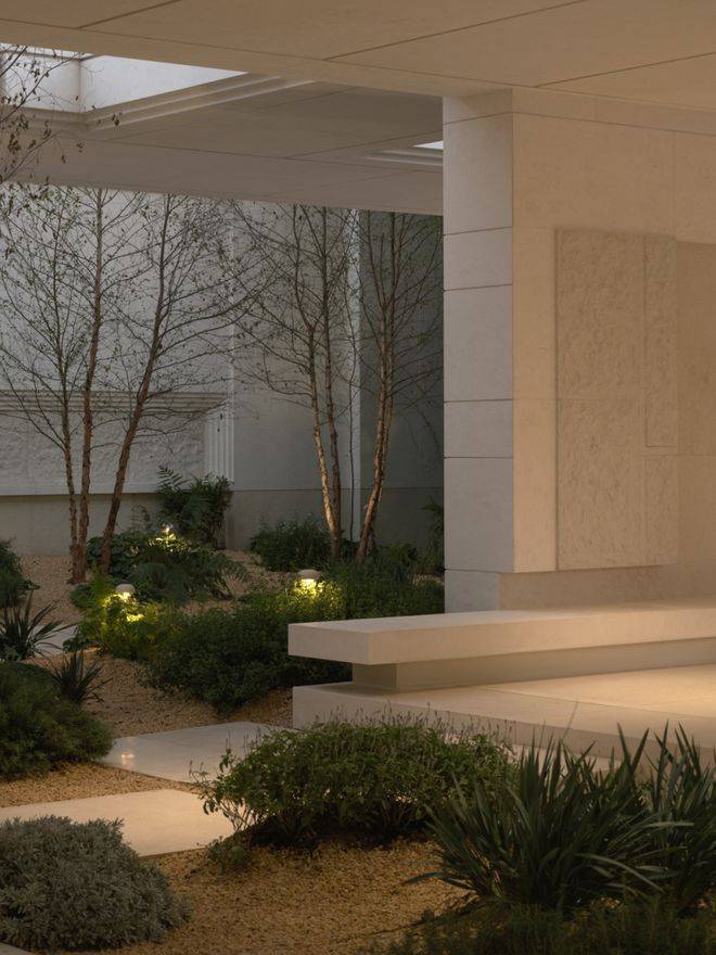 漂浮的海角花园自由延展,砾石花园与林台错落交融,树影与水光相映成趣。米白墙垣与古铜铝板的肌理在光影中呼吸,植物舒展的枝桠以舞蹈的姿态定格成永恒油画。