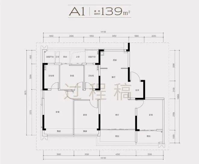 2)139方A1南厅户型,4房2厅2卫,得房率86%