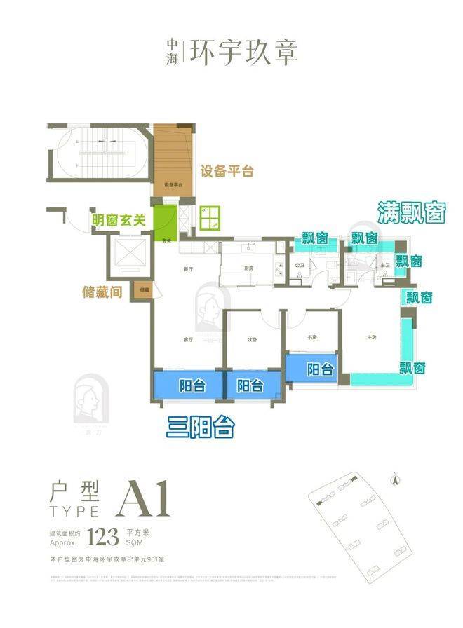 以建面约123㎡3房为例,南向4开间,3阳台+6飘窗+1设备平台。