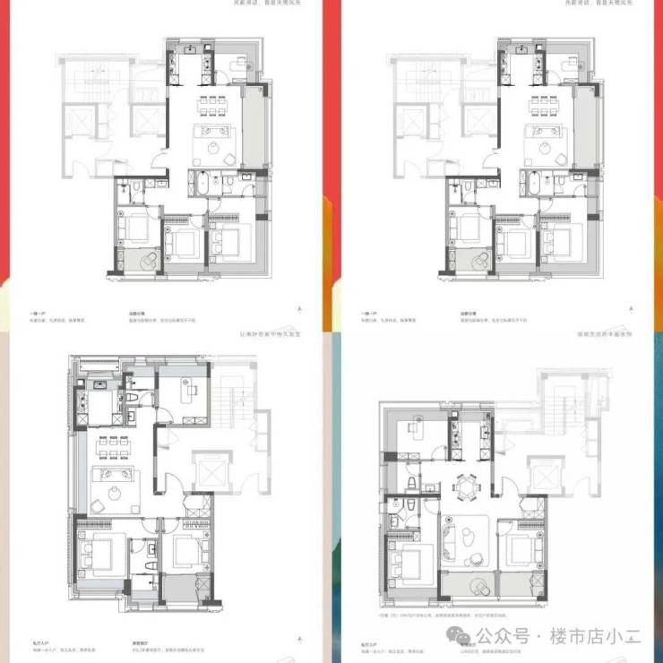 建面约139㎡四房更进一步,南向总面宽超10米,客厅开间约5.7米。主卫采用四分离设计并预留浴缸位,主卧套房和北次卧更是带来双270°转角飘窗。这在140㎡以下户型中相当罕见。双转角飘窗设计让采光和视野最大化。