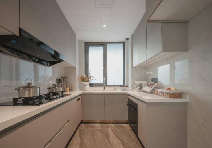 建面约310㎡的边套,首层南向横厅面宽就达到了约6.9米,厨房面宽约5.5米,可以阔绰地分出中西厨;