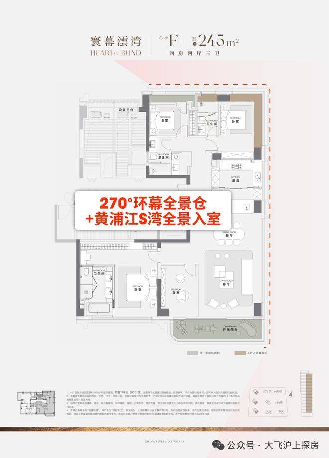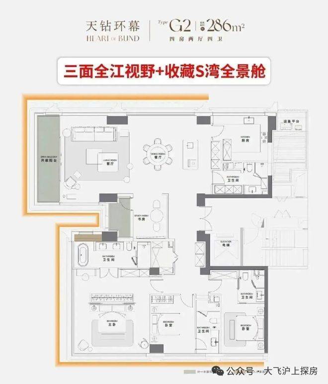 286㎡户型:三面瞰江设计,10米IMAX落地窗,三套房+独立家政间,主卧约40㎡带双衣帽间。