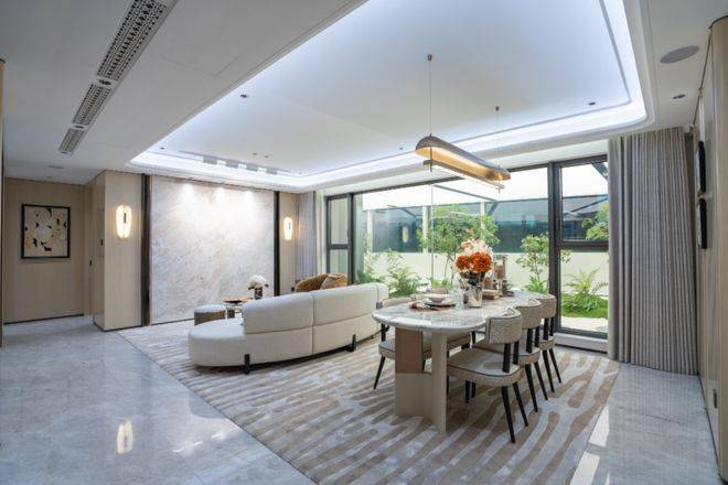 最让人震撼的是123户型客餐厅,面宽约6.6米,在拓展两个阳台后,客餐厅面积可达约40㎡,和150-160㎡客餐厅尺度相当。
