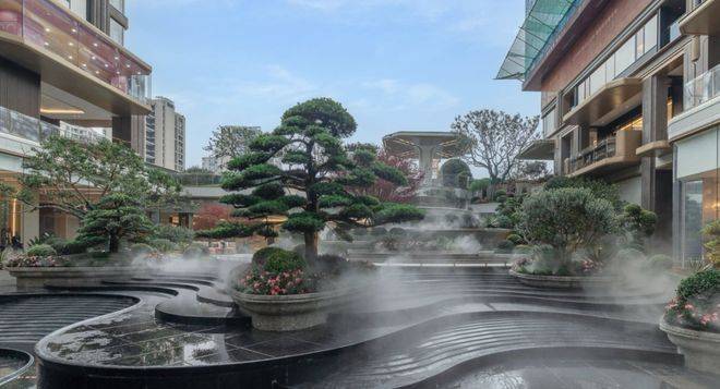 走进园区,这种颠覆感更为强烈。项目巧妙地利用超过10米的地形高差,摒弃了传统的堆坡造景,匠心打造出一座立体的“峡谷”庭院。山石、水景、古松与一个个通透的“玻璃盒子”(架空层)交错叠落,漫步其间,仿佛不是在回家,而是在游览一座精致的艺术馆或奢侈品概念店,每一步都是景致与意趣。
