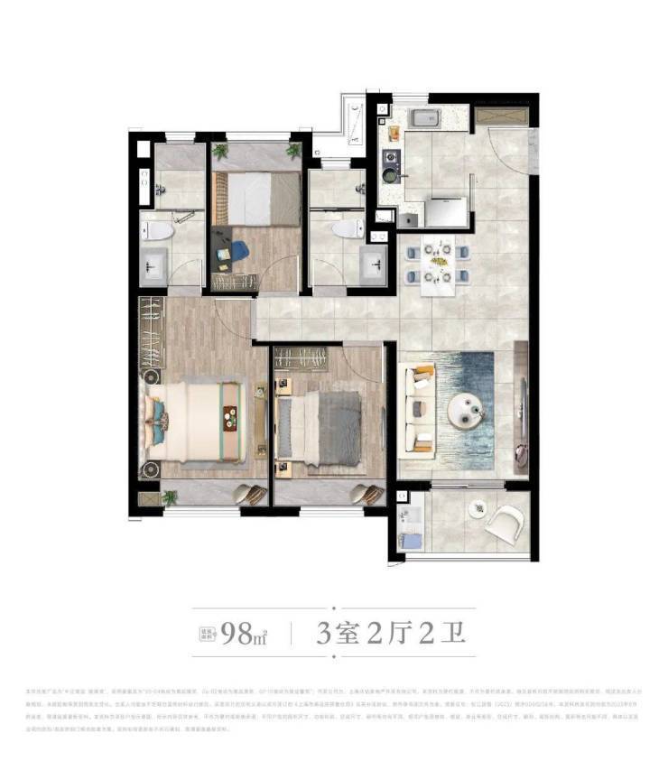 [ A户型 ] 建筑面积约98㎡ | 3房2厅2卫
