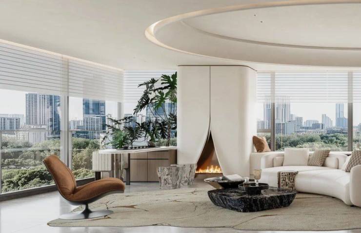建筑风格:外立面采用伊朗进口“蓝眼睛”奢石、铝板和大面玻璃,融合宋代官式元素如庑殿顶、飞檐斗榫等,打造“”高端住宅 。35