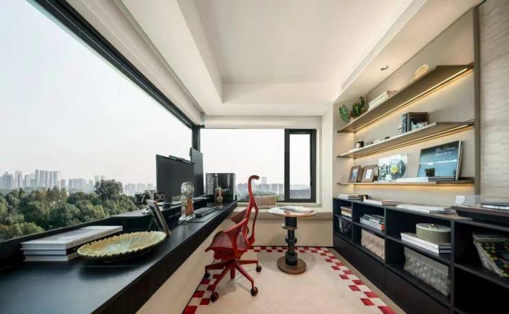 一整面墙做成书架,放上这些年没来得及读的书;角落摆一张厚实的长桌,孩子能趴在这儿做手工、画油画,不怕弄脏地板。