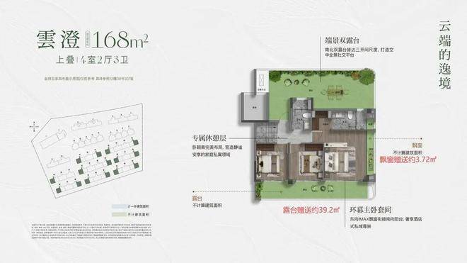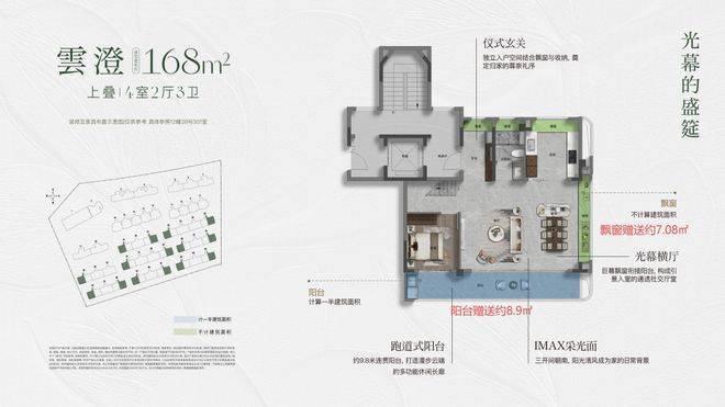 约168㎡上叠;这个户型同样独立电梯厅,但是三面宽设计,南向三阳台空间并列。