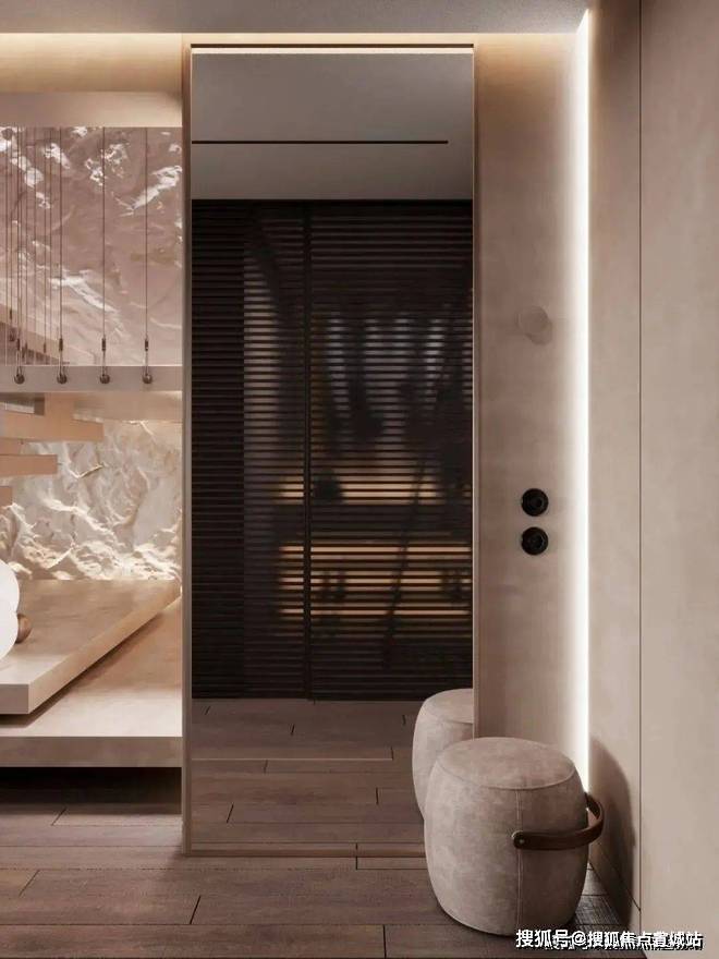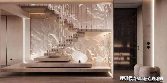 阶梯处更具艺术氛围,里面装饰墙凹凸不平,拾级而上,垂挂的金属吊灯有条不紊,营造了一种浪漫而温馨的氛围感。