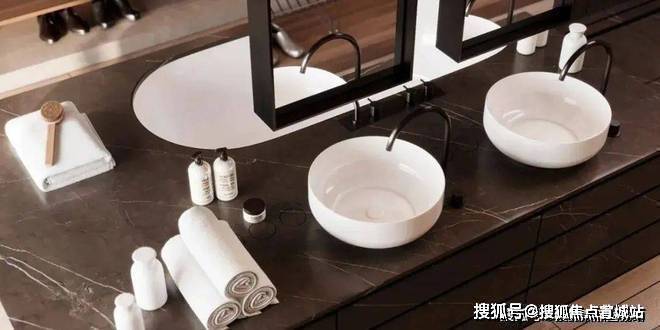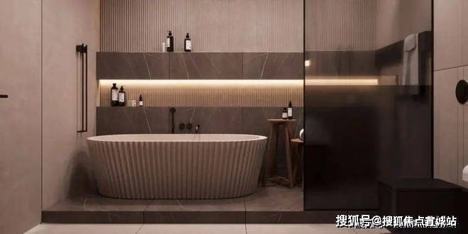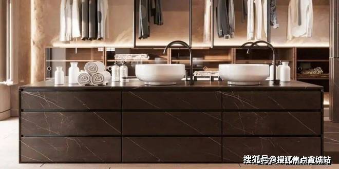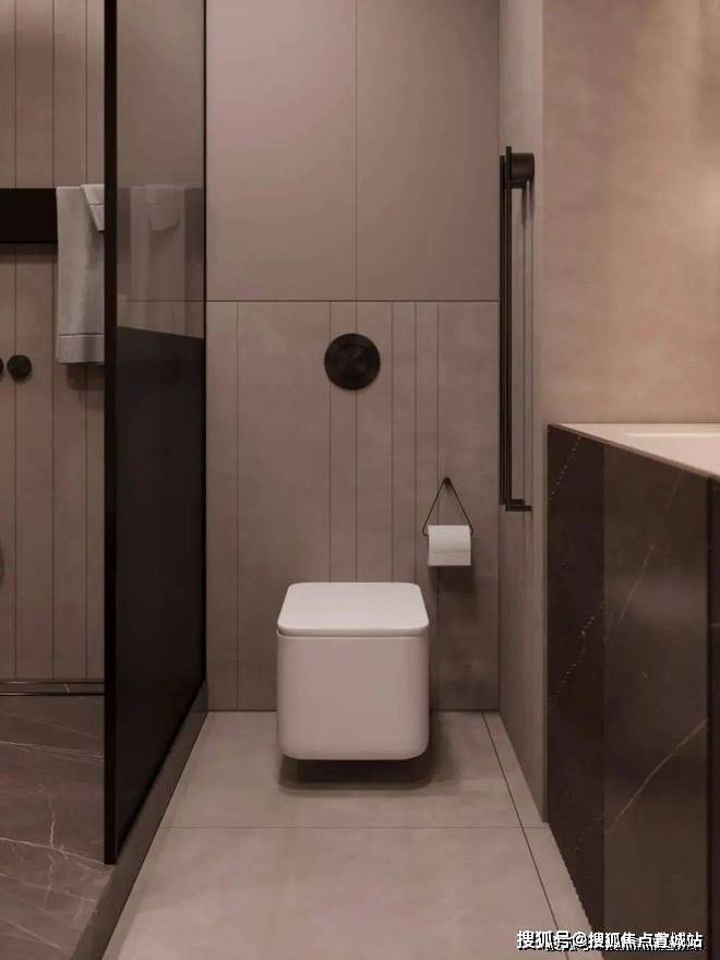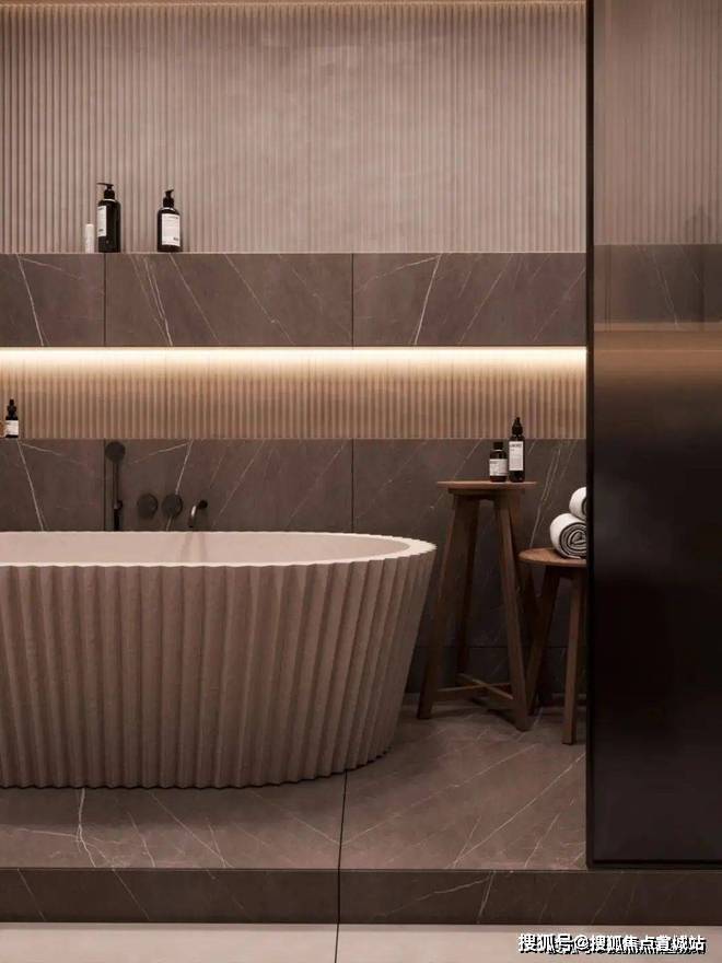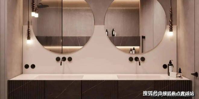 卫生间宽敞而明亮,摈弃过多的射灯或主灯,而是沿用部分照明灯具,立面的装饰线条参差不齐却独有韵味,深色大理石柜体压低了空间的调性,让空间的层次轻重分明。
