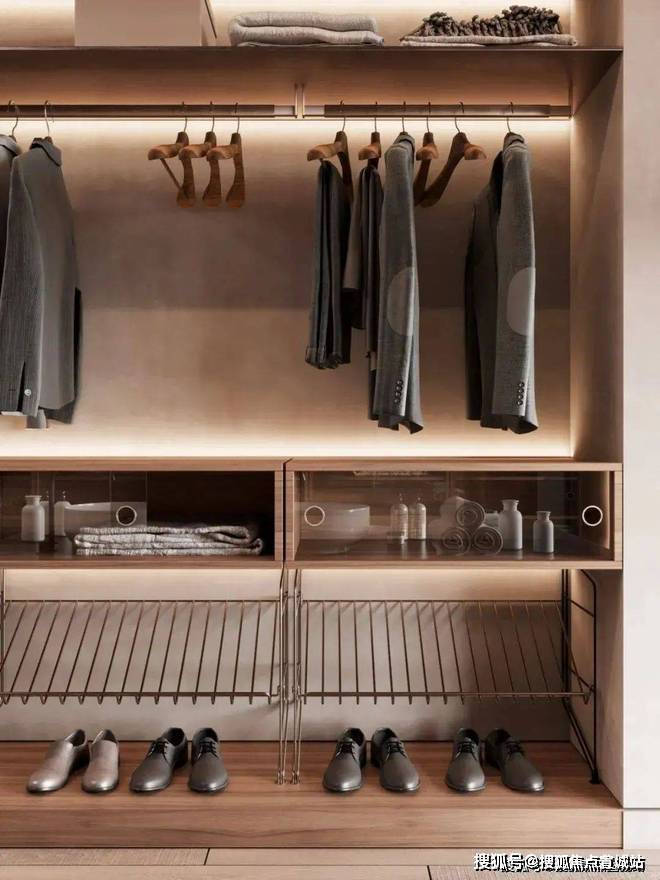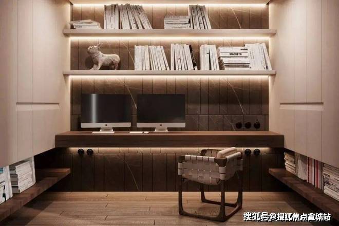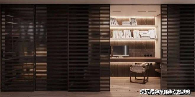 书房的隔间具有相当隐秘性和半开放性,黑色半透双开门很好的隔离了书房、更衣间和主区域,书房的面积不大,却干净、温暖,在辅助灯源的装饰下,营造了更多的居家惬意气息。