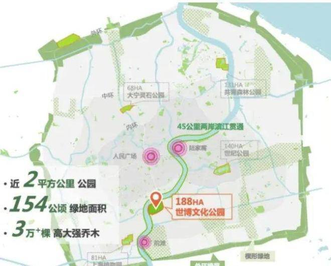 世博文化公园的面积更大,共计近2平方公里,相当于25个人民公园,是中心城区最大的公园绿地。另外,世博文化公园旁边还有面积达2.5平方公里的黄浦江水域,公园可与这一广阔水域相融。