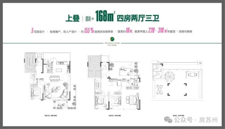 两款户型,建面约168/188㎡,均是独梯独户+双入户设计+约10米大面宽+约155%得房率的神户型!其中上叠更是实现了“5花园设计”!