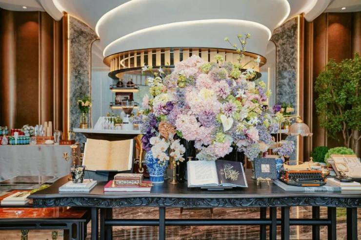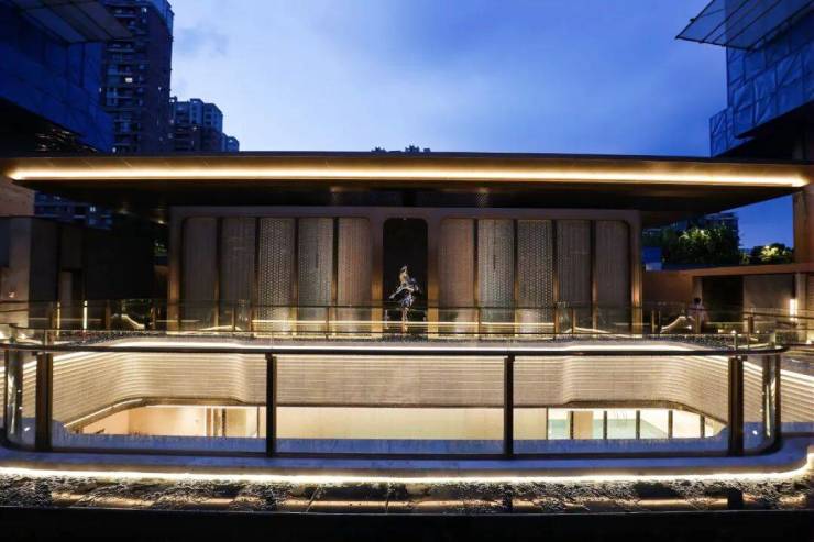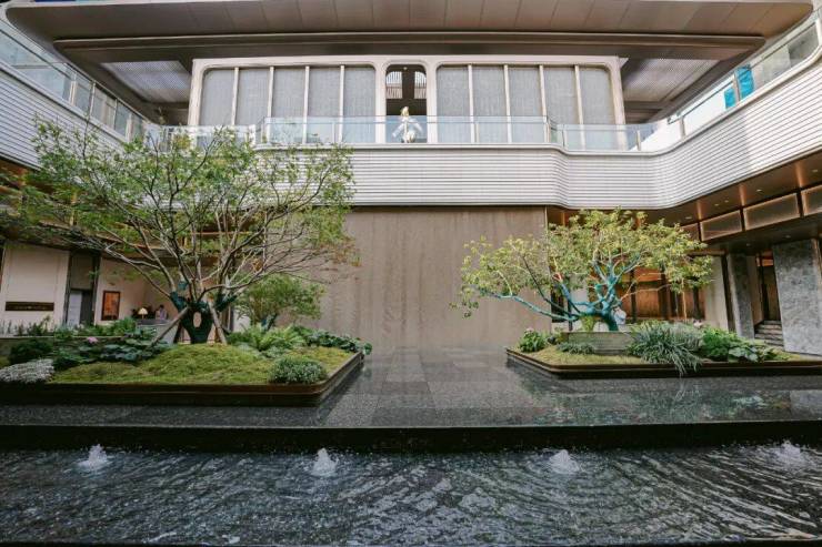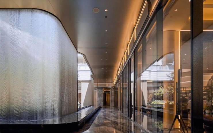 整体长约18米、进深约9.5米的下沉庭院——星池雅宴,将空间意境与社交属性的精准定义,引入“琉璃光院”的通透与灵性,将玻璃砖景墙与金属网水幕作为空间的核心元素,尽显海派雅奢风情。