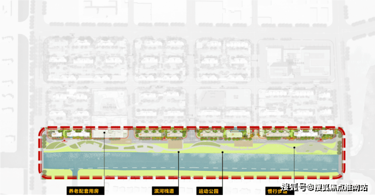一界面是滨水景观界面(项目红线外),依托南侧的天然水系及滨水公园,打造慢行景观系统,并将滨河栈道、运动公园、骑行等多种功能嵌入,提升舒适度的同时,也为居民提供放松身心的好去处。