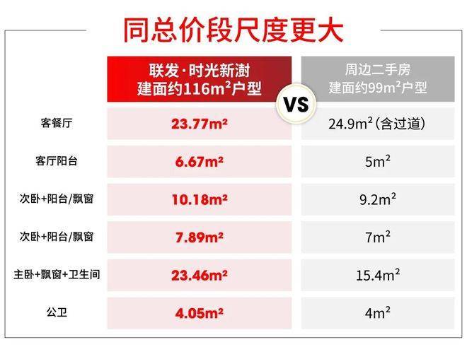 而建面约116m²户型的预估总价与周边二手次新99m²房源挂牌总价相近,但室内空间完全不是一个量级!