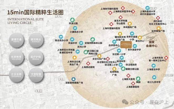 潮流商业:蟠龙天地、虹桥天地、龙湖天街、中核和悦荟、洛克公园(美的内)、首位show(含奥特莱斯)、开市客、前湾印象城、万科天空之城广场、丽宝广场、夏都小镇、食尚天地、徐民东路美食街、奥特莱斯(赵巷)、上海超级合生汇(在建中);优质教育:上海中学(9年制,在建中)、青浦世界语外国学校(15.5年制 从托班到高中)、徐泾中学、徐泾小学、徐泾幼儿园、世蒙幼儿园、西华国际学校、美国学校、英国学校、新加坡国际学校、台商子女学校等(非学区承诺,具体以政府官方信息为准);医疗护航:华山医院虹桥院区、新虹桥世界医疗中心、冬雷脑科医院、德达医院、徐泾社区医院等;