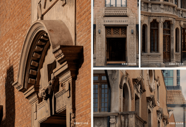 外立面融合江南园邸、现代主义、近代装饰主义等多元风格,拥有百余种海派建筑符号,精心打磨给人以克制、简雅、低调奢华的姿态。