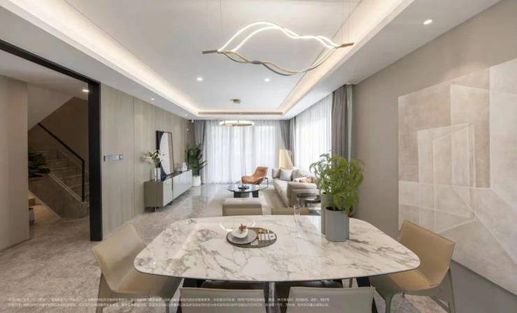 下叠四房两厅三卫的设计。一层南向整体面宽约10.8米,餐客厅一体,连通约7.2米的长阳台,大横厅与落地窗的搭配,增加了室内空间与庭院的互动。一层独立入户,南北通透客餐厅一体的起居空间,足以容纳一个大家庭的节日聚餐或是一场精致的下午茶party。