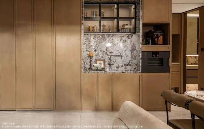 更是在137㎡宅邸中设立大尺度收纳柜体,集净衣区/生活冰箱/水槽/西厨咖啡等功能于一体,创新设立独立家政空间,涵盖洗衣机+烘干机+收纳柜功能,让阳台的风景更纯粹。