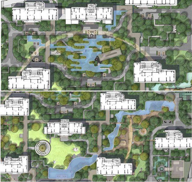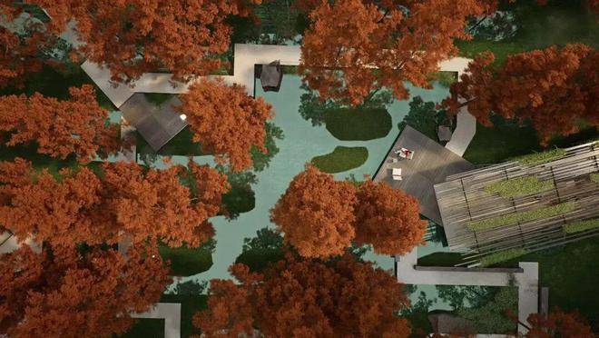 再配合建筑的曲线流动感、小池塘、溪涧、不同形态的植被