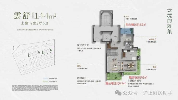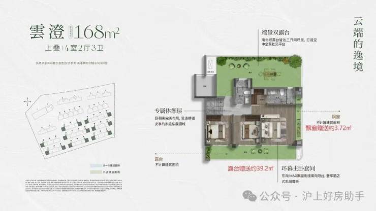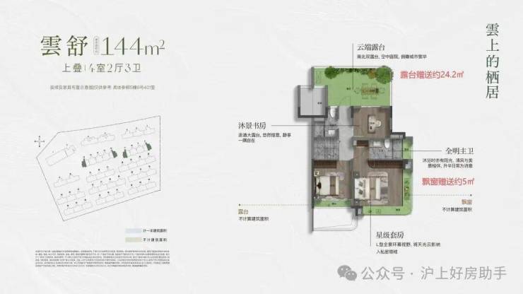 建面约144㎡的上叠产品,通过巧妙的挑空、总计约15㎡露台及灵动空间设计,让户型的 实际可使用面积高达约180 ㎡,实得率约125%。