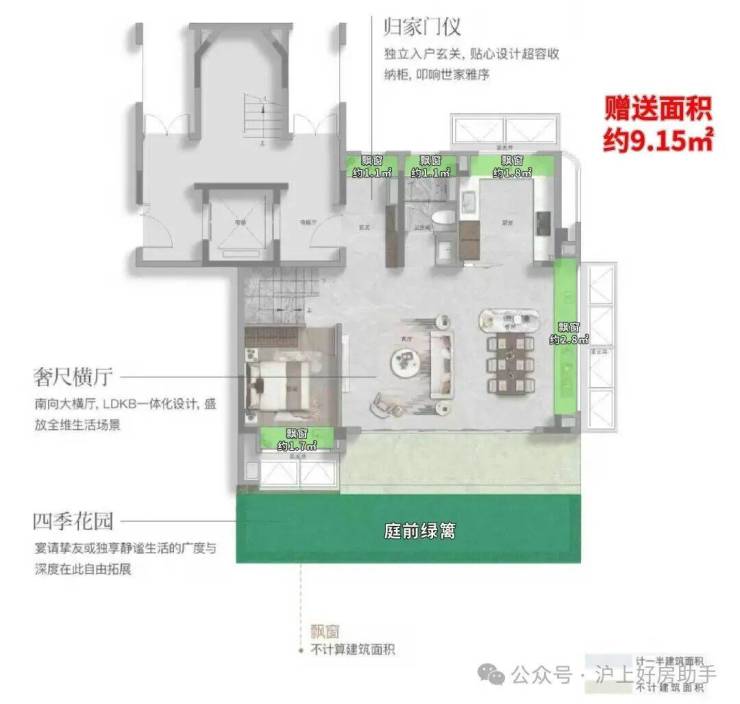 在细节打磨上,此户型亦不遗余力。 全屋飘窗全赠送约9.8㎡,配合约7.2㎡的大阳台(计一半建筑面积)不仅增加了实际使用面积,更在视觉上提升了空间的通透感。