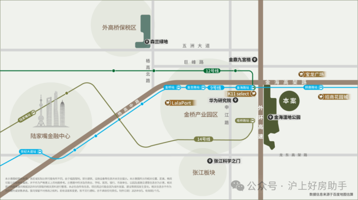 项目位于金桥东,金海湿地公园旁,9/12号双轨交汇,自驾出行的话周边有外环高速、金海高架路、往南还有龙东高架。从通勤角度来看,这是一个去陆家嘴、外高桥、金桥、张江都很方便的地段,可覆盖的人群非常广泛。